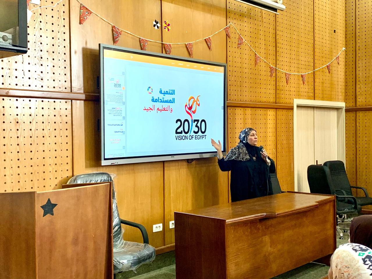 جاء خلالها معرفة الطلاب بأن محور التنمية المستدامة ورؤية مصر 2030 تقوم على بناء الإنسان والاستثمار فى البشر وبناء قدراتهم الإبداعية