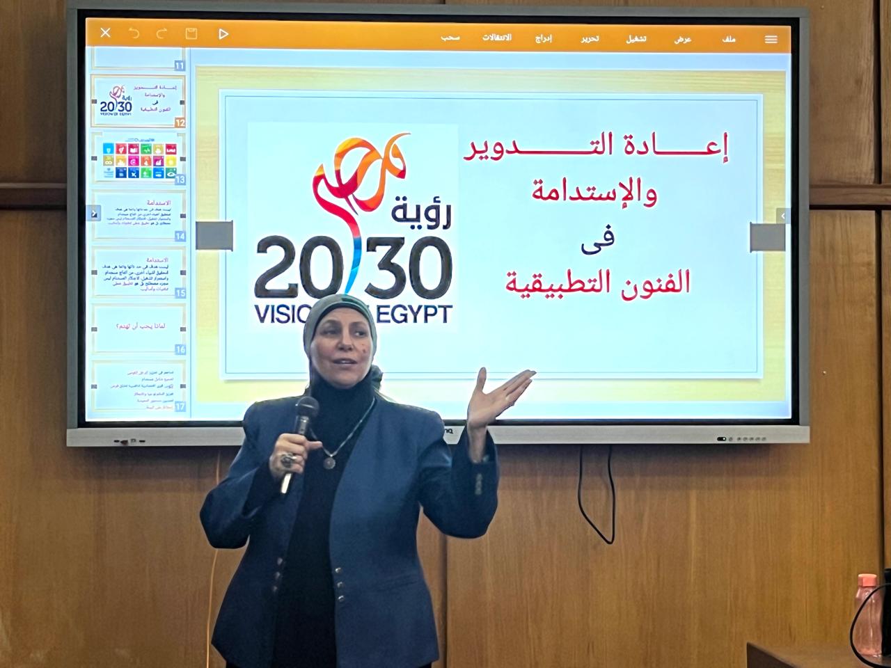 حاضرت في الورشة الأستاذ الدكتور مها عامر القائم بعمل رئيس قسم طباعة المنسوجات والصباغة والتجهيز ومدير وحدة تكنولوجيا المعلومات حيث تناولت أهمية إعادة التدوير في مجالات الفنون التطبيقية عامة ودورها الحيوي في دعم أهداف التنمية المستدامة من خلال استثمار المخلفات وإعادة توظيف الخامات بطرق مبتكرة تسهم في تقليل الأثر البيئي وتعزز الإبداع الفني.